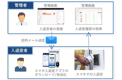 スマートフォンの専用アプリに保存されたセキュアな入退室ID情報を用い、ICカードの代わりとして入退室が可能